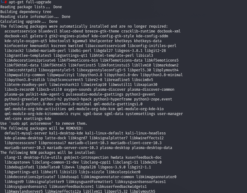 | Description | Hi. I faced problem of deleting environment after full-upgrade of kali distro. But now i understood that at time of full-upgrade it wants kali kde removal.I am including picture for your understanding.Please fix these.Or give a proper solution. | ||||