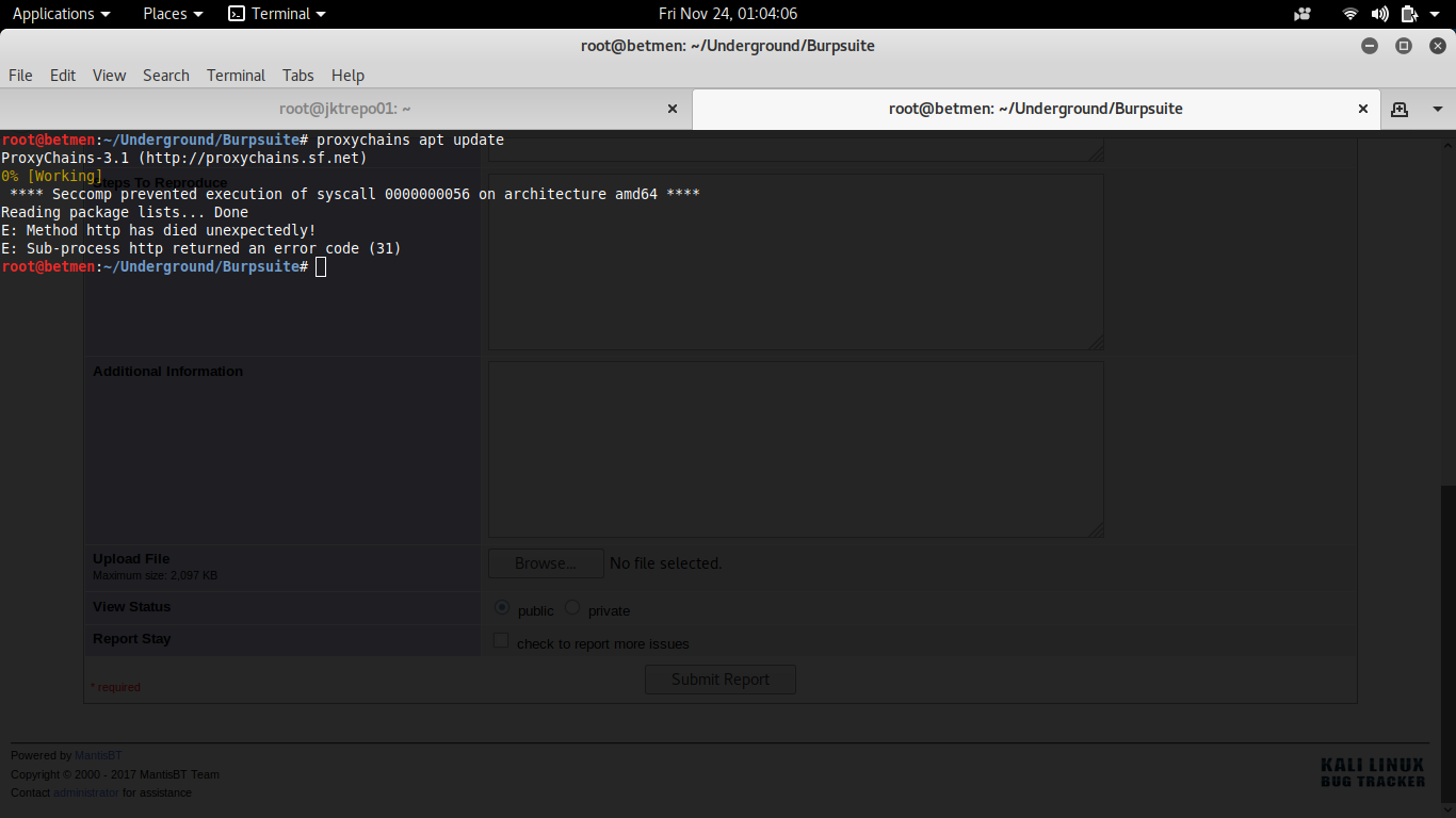 | Description | in kali 2017.2 proxychains with apt-get is running normal, but in 2017.3 crash. here the message: Seccomp prevented execution of syscall 0000000056 on architecture amd64 | ||||