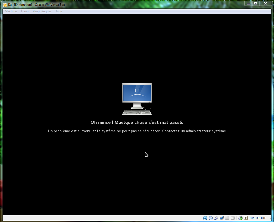 | Description | Hi, I have tried to install Kali Linux on VirtualBox (Windows 7 64) several time, but I always get the message on my desktop " Something went wrong. A problem has occurred and the system can not recover.". And I can't access to menu or other stuff. If someone had the same issue or someone who have the solution, can you share it with me, please ?!. Thank you! P.S.: The error message on screenshot is in french.Sorry for inconvenience. | ||||
