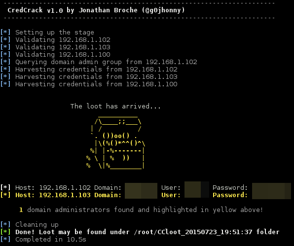 | Description | CredCrack is a fast and stealthy credential harvester. It exfiltrates credentials in memory and in the clear without ever touching disk. Upon obtaining credentials, CredCrack will parse and output the credentials while identifying any domain administrators obtained. CredCrack also comes with the ability to list and enumerate share access and yes, it is threaded! CredCrack has been tested and runs with the tools found natively in Kali Linux. CredCrack solely relies on having PowerSploit's "Invoke-Mimikatz.ps1" under the /var/www directory. Script: https://github.com/gojhonny/CredCrack | ||||