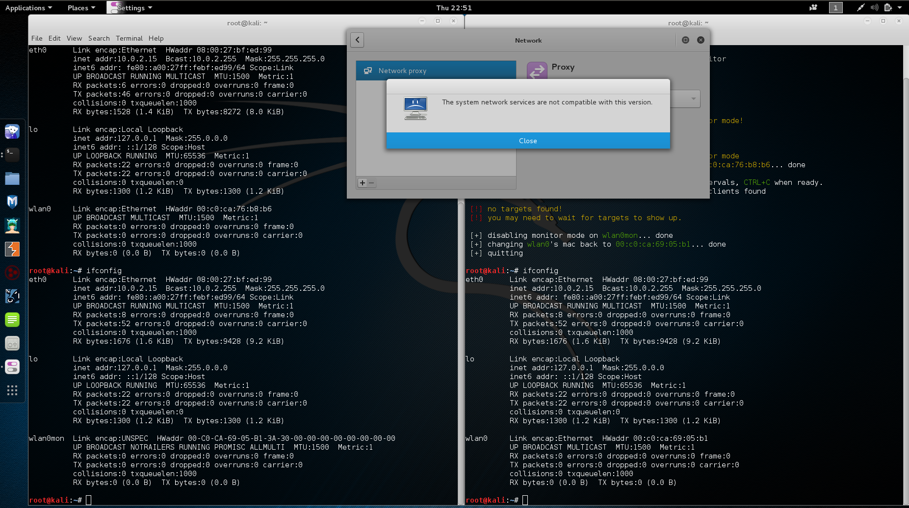 | Description | After using wifite on the commandline, the network tools function (system settings) doesn't work. The wireless card still shows up when doing ifconfig, but can not connect to any access points or even view the network settings dialogue (system settings). | ||||
