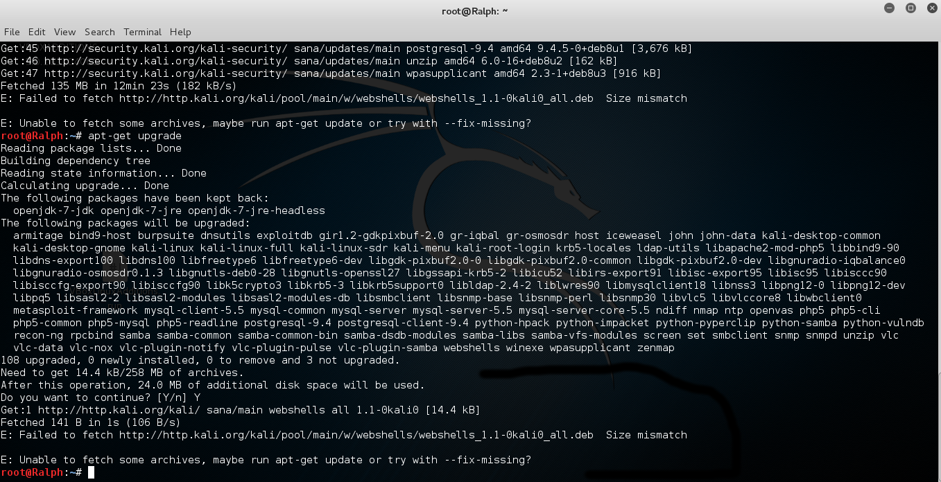 | Description | After Update to Kali Sana 2.0. with my host system i got this issue with upgrading my system " E: Failed to fetch some archives, may run apt-get update or try with --fix-missing? " I also installed on VM trying to see if it was my computer that was having this but problem. But unfortunately I encountered the same isuue after using | ||||