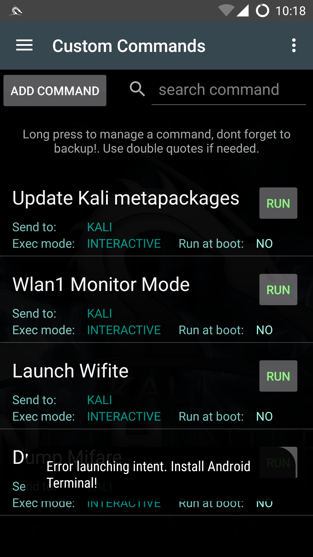 | Description | My device is Note 3 with latest Kali NetHunter 3.0.5 (Builded on 2016/02/03) When I try to enter some part of NetHunter app, it says "Error launching intent. Install Android Terminal" Tried 3 terminals from the store but it didn't work. NetHunter still requesting original terminal (WHICH COMES WITH ORIGINAL PACKAGE i think). Here failing parts: ? Kali Services (I don't know) I didn't test others SearchSploit, Bad USB Attack... I think you get the idea. It should know any terminal app and work with it. I uploaded a screenshot too | ||||