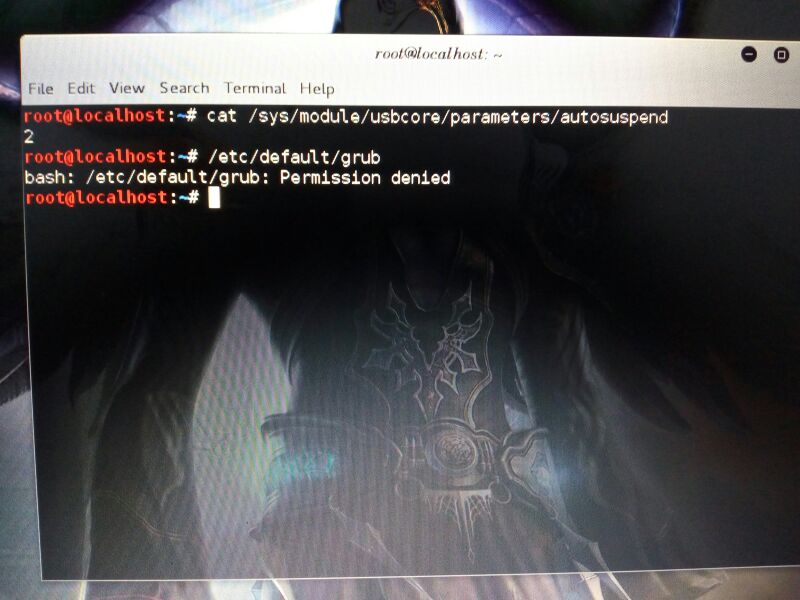 | Description | my Kali (Sana) 2.0 has developed a freezing issue, so I opened my terminal n typed in 'cat /sys/module/usbcore/parameters/autosuspend' please note that I'm signed in as the root user and should therefore have all the super user privileges. | ||||