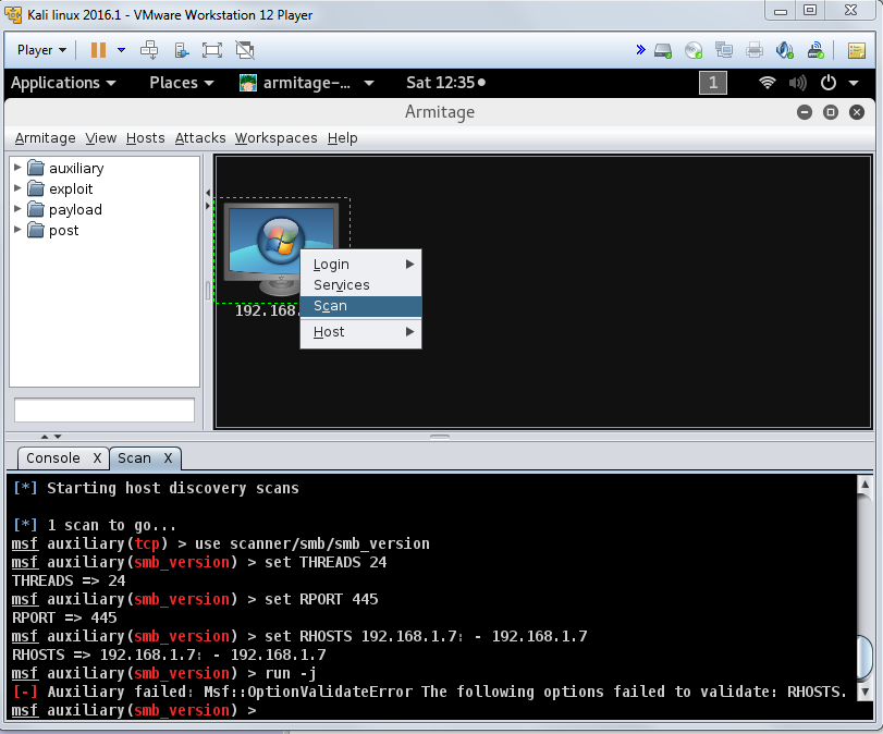 | Description | When a right click from A host in the attack window of armitage and select scan this happens: