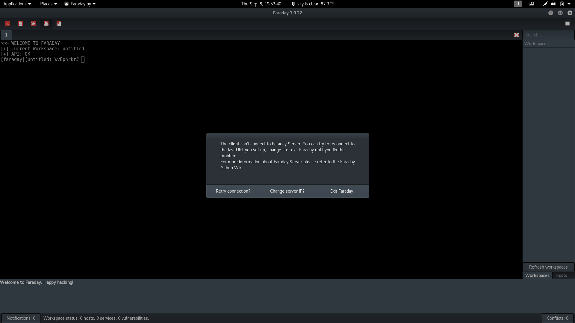 By default in Kali the Faraday Server IP is set to: You have to "Change the Server IP" and set it to http://127.0.0.1:5985 You can check the IP of server in ~/.faraday/config/server.ini (part [faraday_server]) |