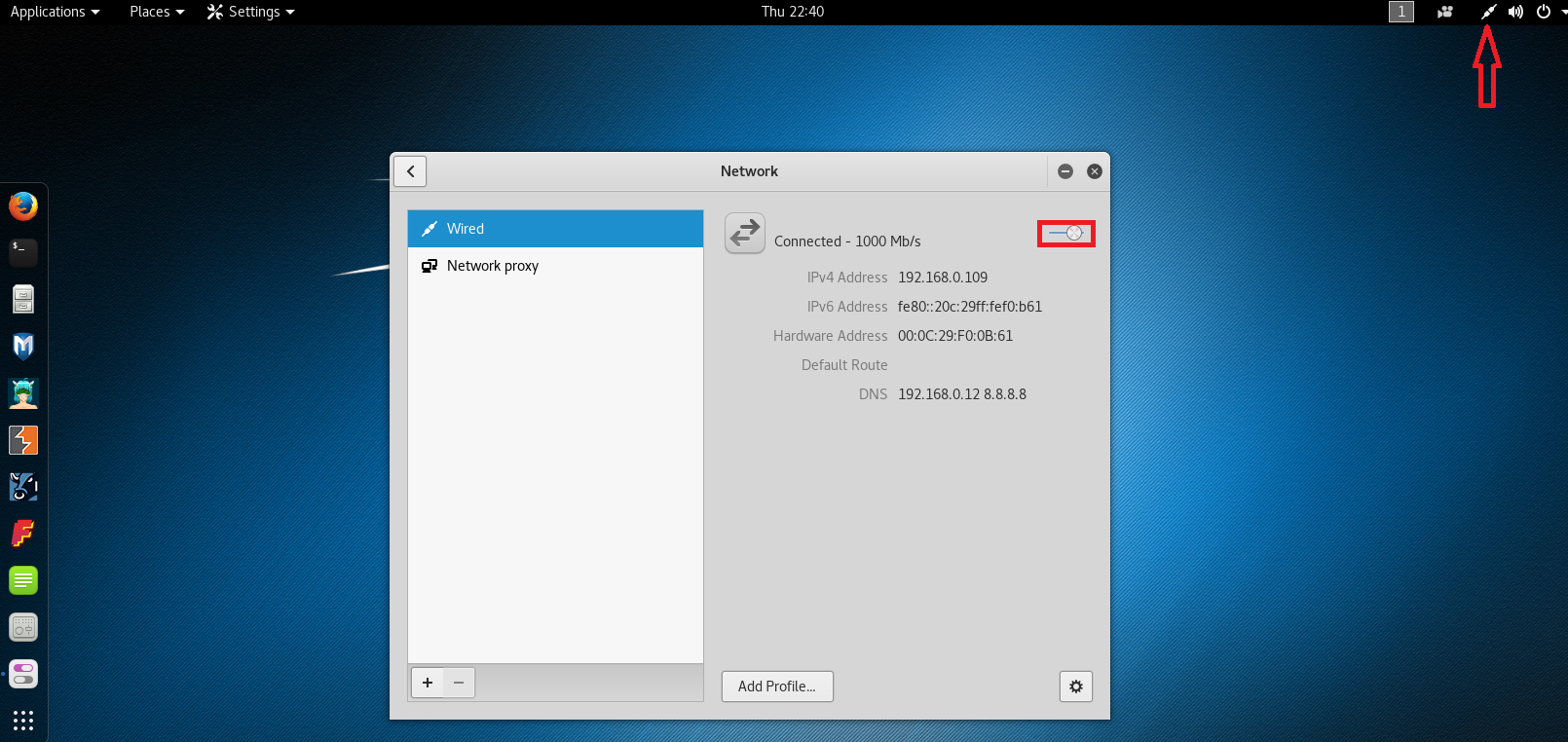 | Description | With gnome-control-center 3.21.92-1kali1, if I toggle the switch as highlighted in the attached picture off, the tray icon (shown by arrow) will turn gray and display an icon representing a disconnected network connection. If I toggle the switch back on, the tray icon will disappear altogether. Turning the switch back off does not display the disconnected icon nor does turning the switch on once more display the connected icon. In a few cases (randomly, as far as I can tell) if I toggle the switch on, the connected icon will reappear. | ||||