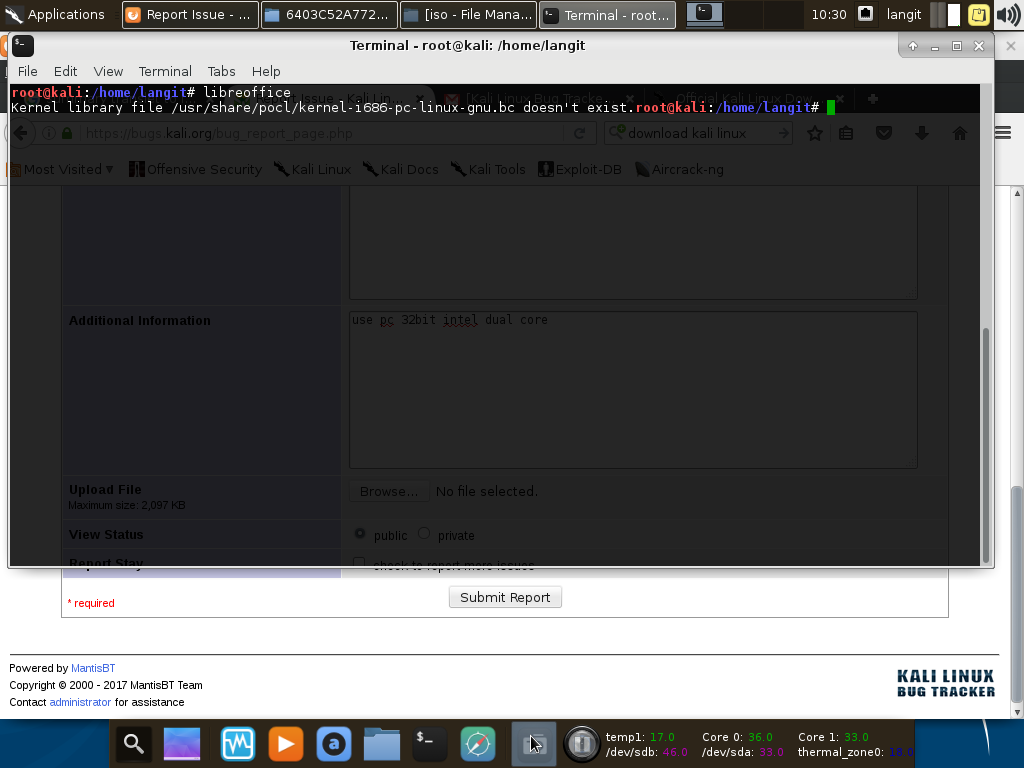 | Steps To Reproduce | install kaliliunx 2017.1 32bit light version. then install libreoffice from repo kali rolling "apt-get install libreoffice". when i run libreoffice on terminal. show message "Kernel library file /usr/share/pocl/kernel-i686-pc-linux-gnu.bc" | ||||