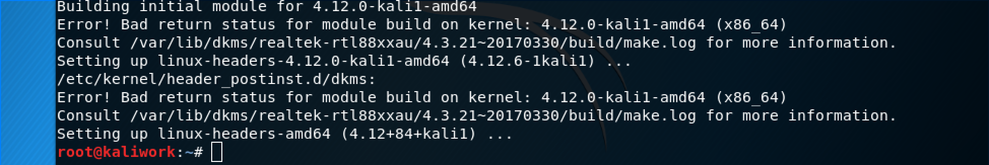 @kimocoder @rhertzog, to follow up this thread, I am posting more detailed info. To summarize: after installing the realtek-rtl-88xxau-dkms package, Kali ends up crashing (no exception), either: