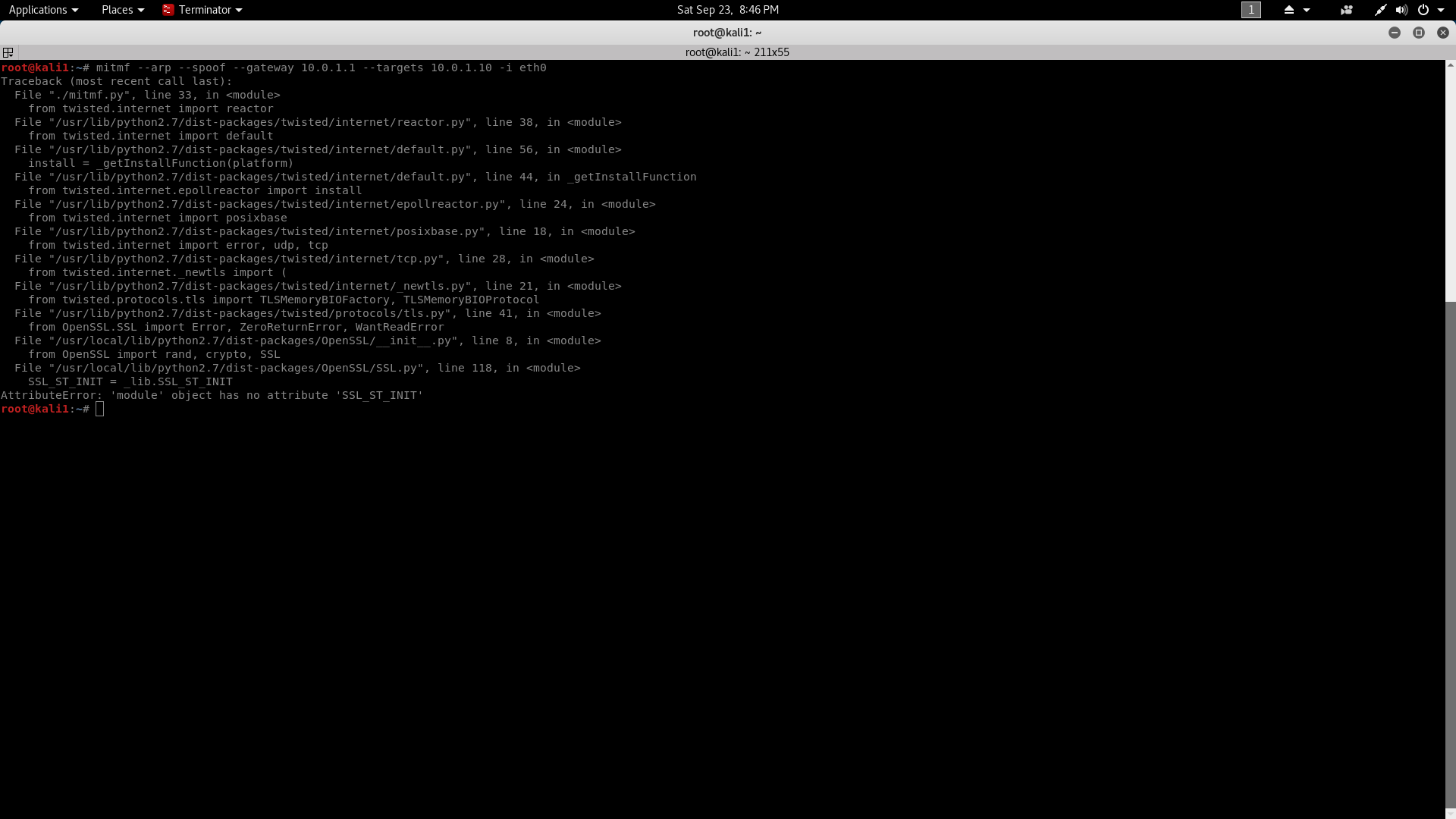 also i tried running older versions of MITMF from GitHub and im getting the same problem even with older versions so there must be something wrong in the latest kali update that is causing this problem |