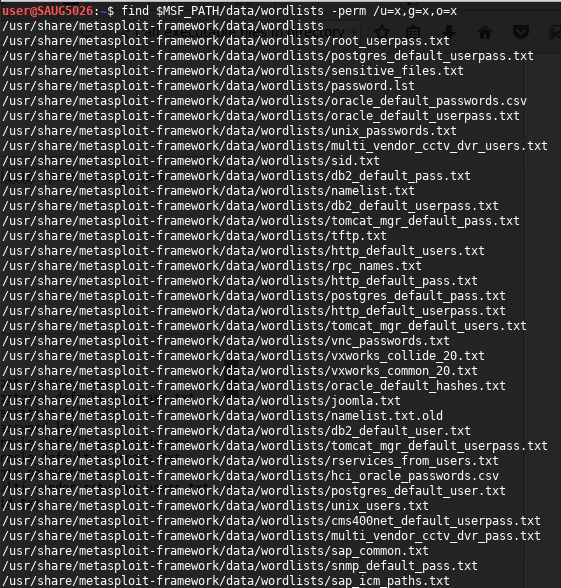 | Steps To Reproduce | $ find /usr/share/metasploit-framework/data/wordlists -perm /u=x,g=x,o=x |