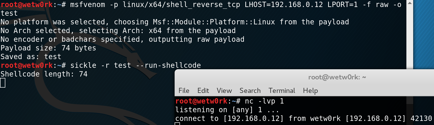 | Steps To Reproduce | git clone https://github.com/wetw0rk/Sickle.git cd Sickle/ apt-get install python3-pip pip3 install capstone chmod +x sickle.py && cp sickle.py /usr/bin/sickle sickle | ||||