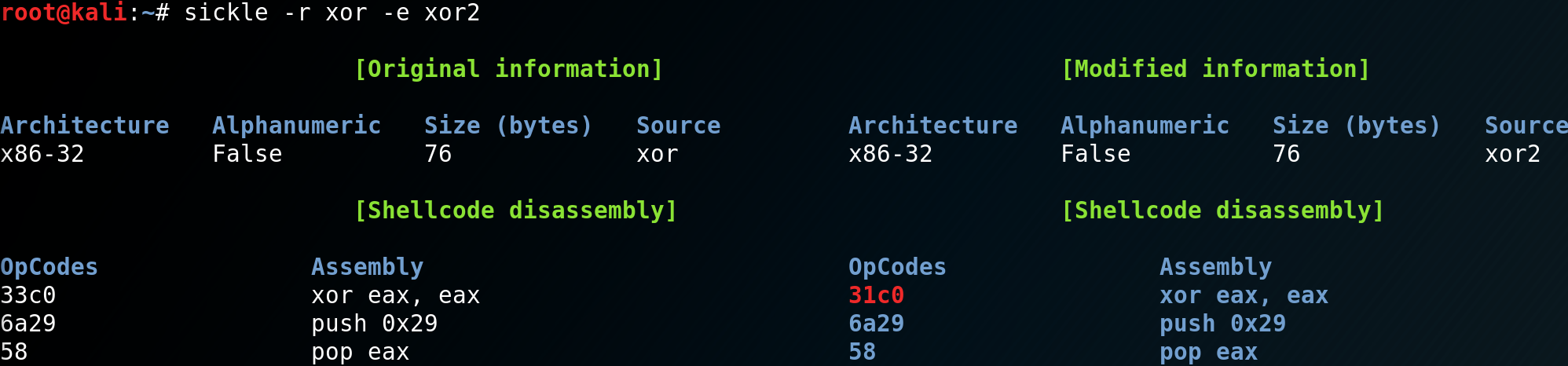 Alright sweet in that case I went ahead and added a new release tag https://github.com/wetw0rk/Sickle/releases/tag/v1.6 Syntax, Running Shellcode in 64bit, and Comparing shellcode has changed. Running shellcode in 64bit is more reliable thanks to contributor luoyeah, and comparing shellcode has dramatically changed since 1.5 (ASM and Opcodes vs just opcodes). Examples below: Identification of instructions what result bad characters: |