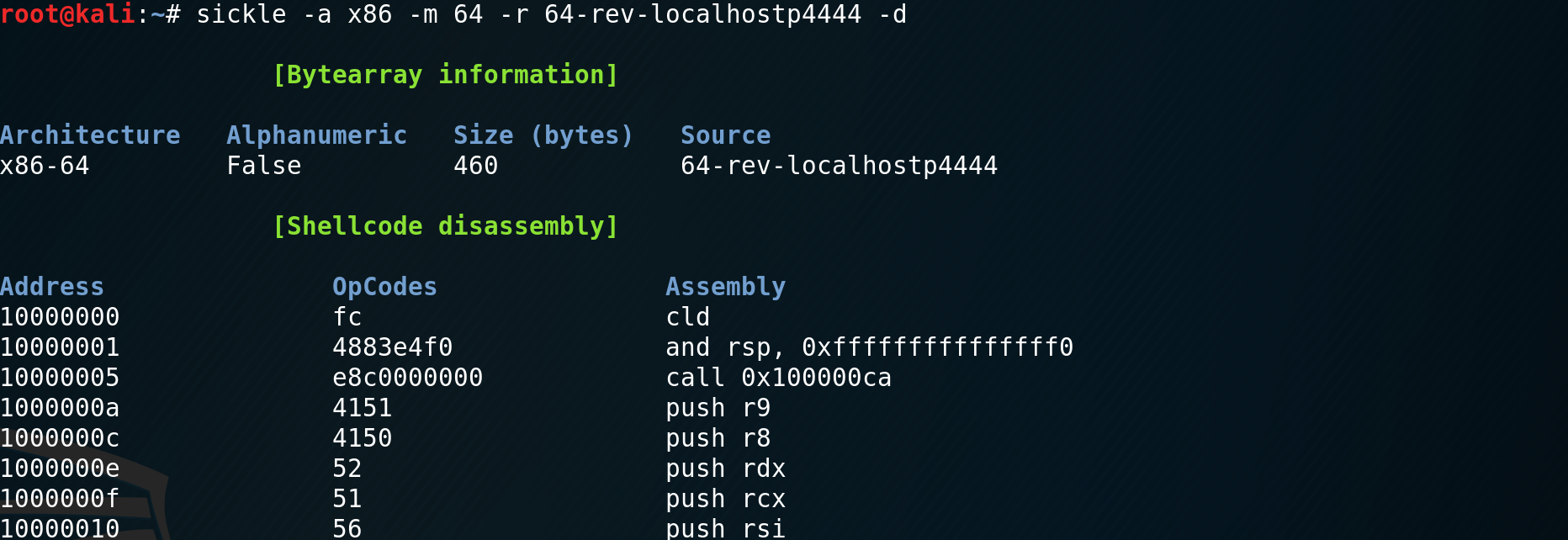 Absolutely, if there’s any other information that would help let me know. Below is the -[Name] - Sickle -[Version] - 1.4 -[Homepage] - https://github.com/wetw0rk/Sickle -[Download] - https://github.com/wetw0rk/Sickle.git -[Author] - Milton Valencia (wetw0rk) -[License] - MIT License -[Description] - Sickle is a shellcode development tool created to speed up the various steps -[Dependencies] - capstone (If used within Kali the existing version of capstone works out of the -[Similar tools] - msfvenom, ndisasm, shellnoob -[How to install] - git clone https://github.com/wetw0rk/Sickle.git -[How to use] - Identification of instructions what result bad characters: I also went ahead and added screenshots. |