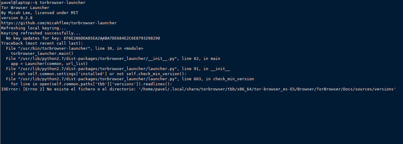 Additionally, even when using default system locale (ES) with latest TorBrowser (v7.5) the launcher no longer works. Seems this was the initial problem. The folder under ~/.local/share/torbrowser was getting installed right but progress bar was not working. Then the launcher crashed leaving the install window orphan. It gives following error due to expecting certain files in the original TorBrowser distribution package: IOError: [Errno 2] No existe el fichero o el directorio: '/home/pavel/.local/share/torbrowser/tbb/x86_64/tor-browser_es-ES/Browser/TorBrowser/Docs/sources/versions' |