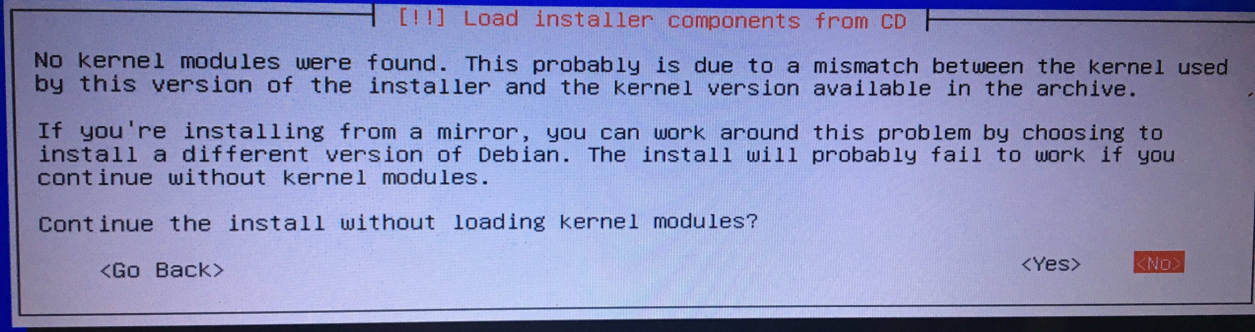 | Description | Trying to install kali light W14 or 02-Apr-2018 this dialog interrupts installation. "Continue the install without loading kernel modules?" Is this a bug? | ||||