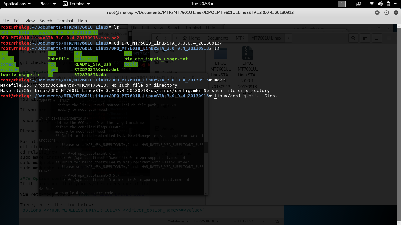 | Description | I try installing drivers from my Pix-Link Dual Band external usb wi-fi from a cd provided by the manufacturer. $uname -a "Linux 4.13.0-kali1-amd64 0000001 SMP Debian 4.13.10-1kali2 (2017-11-08) x86_64 GNU/Linux" Kali directly installed on my old Sony Vaio. From the drivers copied to Documents: root@rhelog:~/Documents/MTK# ls -First Folder: root@rhelog:~/Documents/MTK/MT7601U Linux# cd DPO_MT7601U_LinuxSTA_3.0.0.4_20130913/ root@rhelog:~/Documents/MTK/MT7601U Linux/DPO_MT7601U_LinuxSTA_3.0.0.4_20130913# ls root@rhelog:~/Documents/MTK/MT7601U Linux/DPO_MT7601U_LinuxSTA_3.0.0.4_20130913# make root@rhelog:~/Documents/MTK/MT7601U Linux/DPO_MT7601U_LinuxSTA_3.0.0.4_20130913# That's the error I get trying to run the "make" command for all three Driver folders provided from the CD. Also tried downloading other wireless drivers from the internet Can I get some help on these, thank you... | ||||