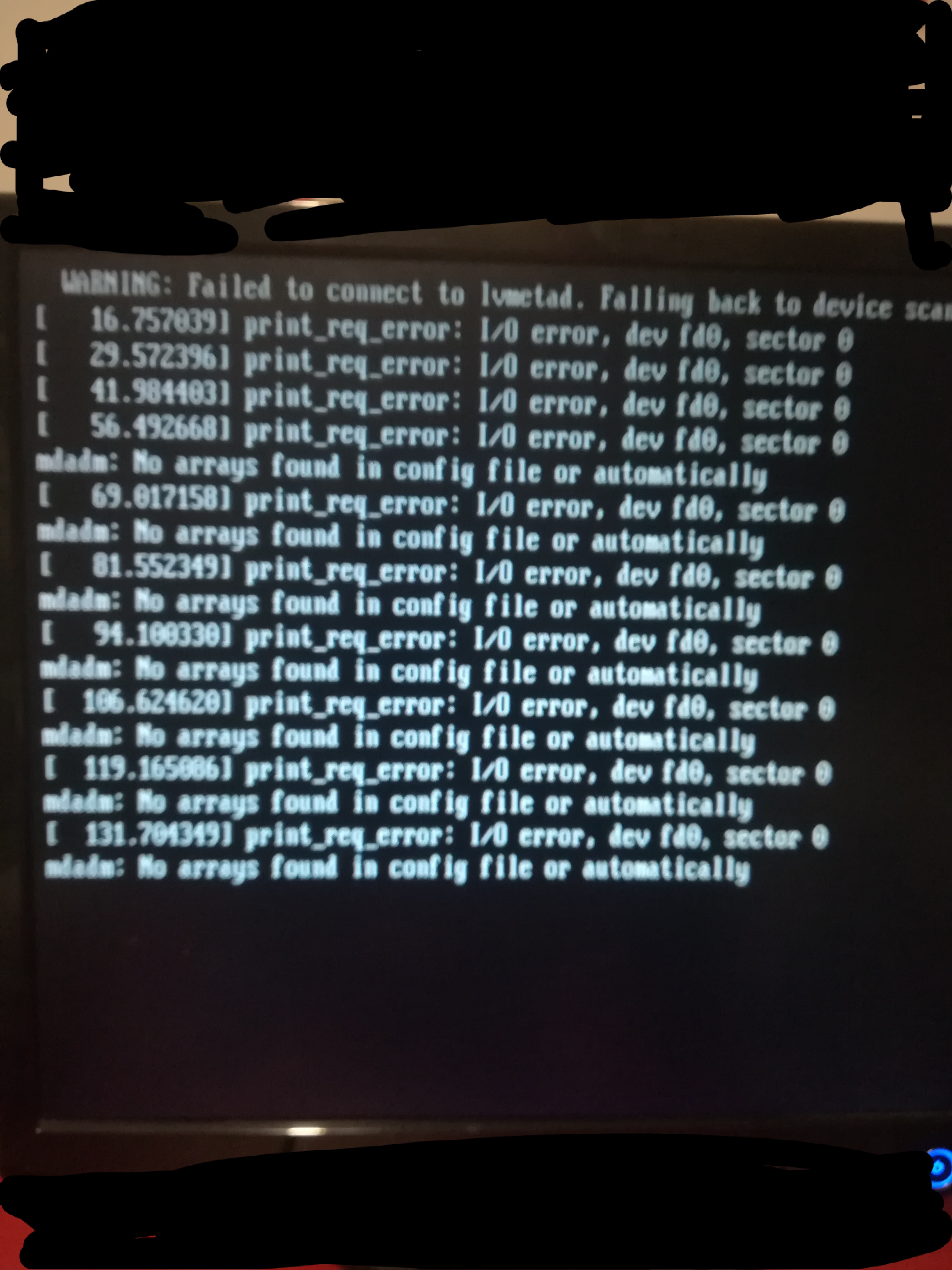 | Description | Hi there, when I try boot the operating system I started to receive errors about mdadm not finding arrays and it tells me that again. I honestly think because of that the OS is pretty much stuck on a loop while booting because of that program. Here is a picture of what is showing me. Can someone help me? | ||||