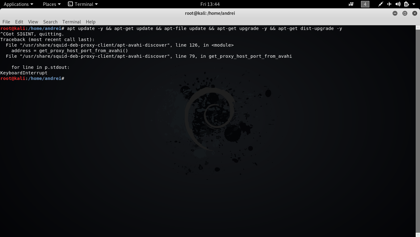 | Description | I keep trying apt-get update And nothing happens, no errors at all. I press enter and absolutely nothing Before this happened I had a dual boot with Windows 7 and had to reinstall Any ideas what went wrong or what I did wrong ? Would prefer not to reinstall Kali also. sources.list contains : deb http://http.kali.org/kali kali-rolling main contrib non-free deb-src http://http.kali.org/kali kali-rolling main contrib non-free When I use Ctrl+C I get (see second screenshot) - same result to any command I use it on apt-get nstall (third screenshot) | ||||