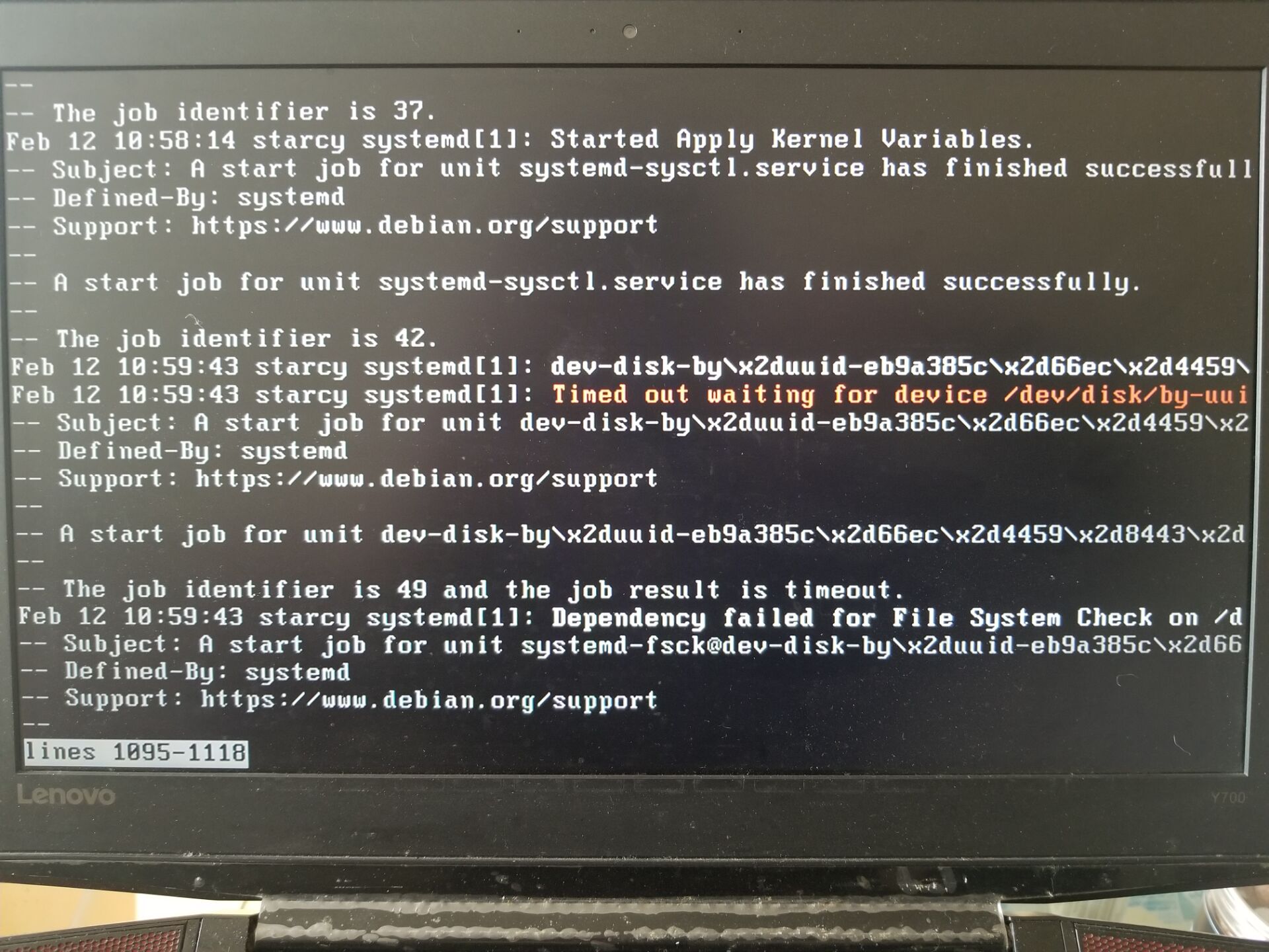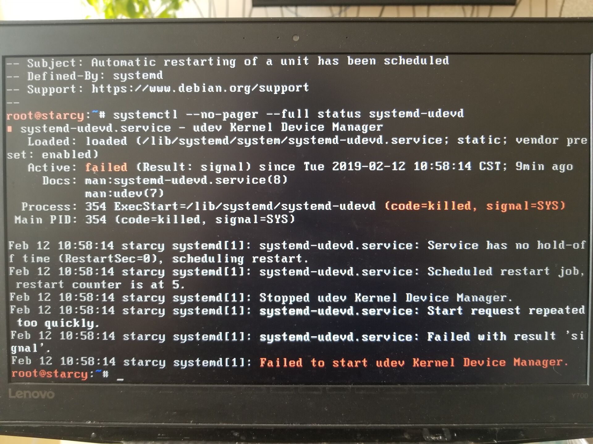This is not a support forum, we can't help you. But if you can attribute your problem to an actionable bug, then we might be able to fix it. Right now you are not providing enough data to even try to help you. Please read https://kali.training/chapter-6/filing-a-good-bug-report/ first. We are a small team and we expect you to provide a much more detailed bug report. Documenting the version of udev, your architecture, your hardware, etc is the bare minimun. Screenshots are not very helpful for textual content. Take the time to save the logs to files on a USB key to share them entirely with us. |