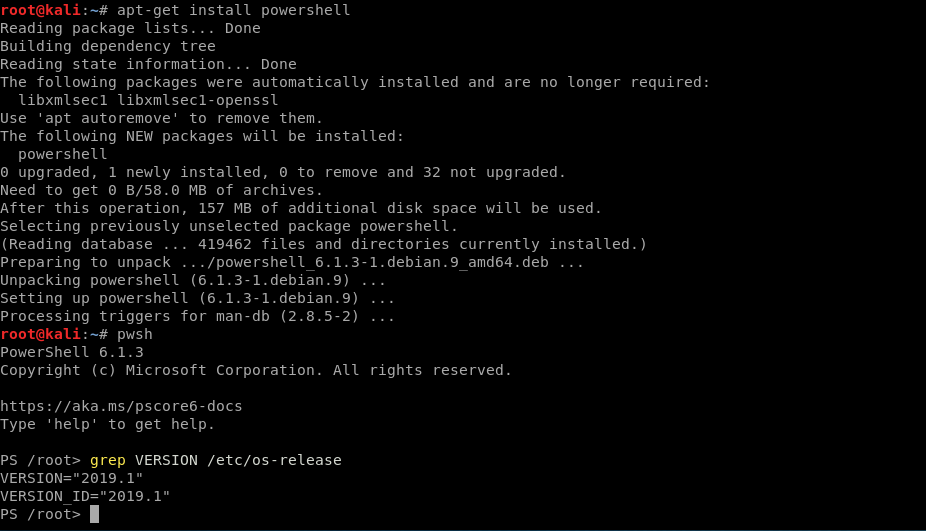 | Steps To Reproduce | I have tested this in Kali Linux 2019.1 and it works very well! First, we need to download and add the public repository GPG key so APT will trust the packages and alert you to any issues with package signatures: curl https://packages.microsoft.com/keys/microsoft.asc | apt-key add - echo "deb [arch=amd64] https://packages.microsoft.com/repos/microsoft-debian-stretch-prod stretch main" > /etc/apt/sources.list.d/PowerShell.list Third we will need to install the following dependency packages below to continue the installation. You can download the package here: libicu57: https://packages.debian.org/stretch/amd64/libicu57/download Once the packages have been installed we can then install powershell on Kali Linux: root@kali:~# apt-get install powershell https://aka.ms/pscore6-docs PS /root/Downloads> | ||||