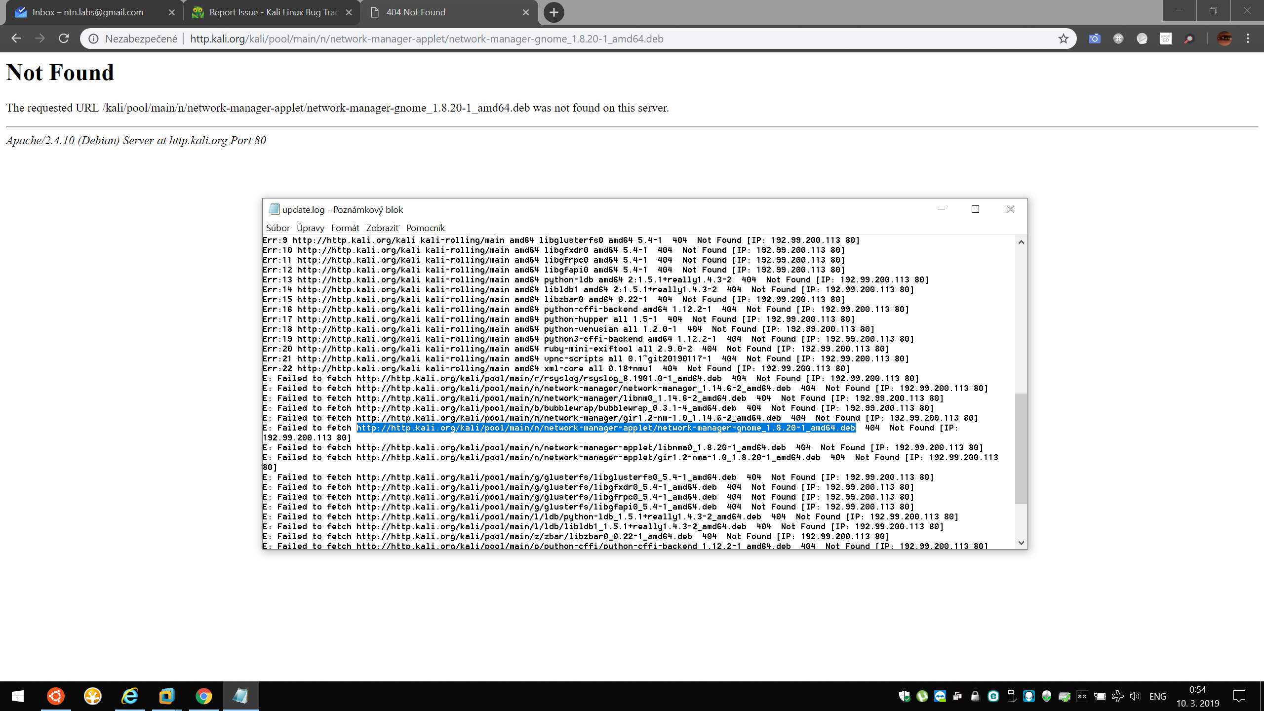 ntn@kali:~$ sudo su [sudo] password for ntn: root@kali:/home/ntn# apt update Hit:1 http://kali.download/kali kali-rolling InRelease Reading package lists... Done Building dependency tree Reading state information... Done 95 packages can be upgraded. Run 'apt list --upgradable' to see them. root@kali:/home/ntn# apt upgrade Reading package lists... Done Building dependency tree Reading state information... Done Calculating upgrade... Done The following packages were automatically installed and are no longer required: libboost-python1.62.0 libboost-system1.62.0 libboost-thread1.62.0 libmozjs-52-0 ruby-dm-serializer ruby-geoip ruby-libv8 ruby-ref ruby-therubyracer Use 'sudo apt autoremove' to remove them. The following packages will be upgraded: bubblewrap cpp-8 debconf debconf-i18n g++-8 gcc-8 gcc-8-base gdm3 gir1.2-gdm-1.0 gir1.2-nm-1.0 gir1.2-nma-1.0 gjs gnome-characters gnome-core gnome-shell gnome-shell-common gnome-shell-extension-dashtodock gnome-software gnome-software-common krb5-locales lib32gcc1 lib32stdc++6 libaio1 libapparmor1 libapt-inst2.0 libapt-pkg5.0 libasan5 libatomic1 libbsd0 libcc1-0 libdap25 libdapclient6v5 libdapserver7v5 libdb5.3 libgcc-8-dev libgcc1 libgdm1 libgfapi0 libgfortran5 libgfrpc0 libgfxdr0 libglusterfs0 libgomp1 libgssapi-krb5-2 libiptcdata0 libitm1 libk5crypto3 libkate1 libkrb5-3 libkrb5support0 libldb1 liblsan0 libmpx2 libnm0 libnma0 libobjc-8-dev libobjc4 libpoppler-glib8 libpoppler82 libquadmath0 libsqlite3-0 libssh-4 libssh-gcrypt-4 libstdc++-8-dev libstdc++6 libtheora0 libtsan0 libubsan1 libvorbis0a libvorbisenc2 libvorbisfile3 libzbar0 metasploit-framework network-manager network-manager-gnome poppler-utils python-cffi-backend python-hupper python-ldb python-pyv8 python-soupsieve python-sqlalchemy python-sqlalchemy-ext python-venusian python3-cffi-backend python3-debconf python3-soupsieve python3-sqlalchemy python3-sqlalchemy-ext rsyslog ruby-mini-exiftool ruby-pkg-config sqlite3 vpnc-scripts xml-core 95 upgraded, 0 newly installed, 0 to remove and 0 not upgraded. Need to get 15.6 MB/195 MB of archives. After this operation, 652 kB of additional disk space will be used. Do you want to continue? [Y/n] y Err:1 http://http.kali.org/kali kali-rolling/main amd64 rsyslog amd64 8.1901.0-1 404 Not Found [IP: 192.99.200.113 80] Err:2 http://http.kali.org/kali kali-rolling/main amd64 network-manager amd64 1.14.6-2 404 Not Found [IP: 192.99.200.113 80] Err:3 http://http.kali.org/kali kali-rolling/main amd64 libnm0 amd64 1.14.6-2 404 Not Found [IP: 192.99.200.113 80] Err:4 http://http.kali.org/kali kali-rolling/main amd64 bubblewrap amd64 0.3.1-4 404 Not Found [IP: 192.99.200.113 80] Err:5 http://http.kali.org/kali kali-rolling/main amd64 gir1.2-nm-1.0 amd64 1.14.6-2 404 Not Found [IP: 192.99.200.113 80] Err:6 http://http.kali.org/kali kali-rolling/main amd64 network-manager-gnome amd64 1.8.20-1 404 Not Found [IP: 192.99.200.113 80] Err:7 http://http.kali.org/kali kali-rolling/main amd64 libnma0 amd64 1.8.20-1 404 Not Found [IP: 192.99.200.113 80] Err:8 http://http.kali.org/kali kali-rolling/main amd64 gir1.2-nma-1.0 amd64 1.8.20-1 404 Not Found [IP: 192.99.200.113 80] Err:9 http://http.kali.org/kali kali-rolling/main amd64 libglusterfs0 amd64 5.4-1 404 Not Found [IP: 192.99.200.113 80] Err:10 http://http.kali.org/kali kali-rolling/main amd64 libgfxdr0 amd64 5.4-1 404 Not Found [IP: 192.99.200.113 80] Err:11 http://http.kali.org/kali kali-rolling/main amd64 libgfrpc0 amd64 5.4-1 404 Not Found [IP: 192.99.200.113 80] Err:12 http://http.kali.org/kali kali-rolling/main amd64 libgfapi0 amd64 5.4-1 404 Not Found [IP: 192.99.200.113 80] Err:13 http://http.kali.org/kali kali-rolling/main amd64 python-ldb amd64 2:1.5.1+really1.4.3-2 404 Not Found [IP: 192.99.200.113 80] Err:14 http://http.kali.org/kali kali-rolling/main amd64 libldb1 amd64 2:1.5.1+really1.4.3-2 404 Not Found [IP: 192.99.200.113 80] Err:15 http://http.kali.org/kali kali-rolling/main amd64 libzbar0 amd64 0.22-1 404 Not Found [IP: 192.99.200.113 80] Err:16 http://http.kali.org/kali kali-rolling/main amd64 python-cffi-backend amd64 1.12.2-1 404 Not Found [IP: 192.99.200.113 80] Err:17 http://http.kali.org/kali kali-rolling/main amd64 python-hupper all 1.5-1 404 Not Found [IP: 192.99.200.113 80] Err:18 http://http.kali.org/kali kali-rolling/main amd64 python-venusian all 1.2.0-1 404 Not Found [IP: 192.99.200.113 80] Err:19 http://http.kali.org/kali kali-rolling/main amd64 python3-cffi-backend amd64 1.12.2-1 404 Not Found [IP: 192.99.200.113 80] Err:20 http://http.kali.org/kali kali-rolling/main amd64 ruby-mini-exiftool all 2.9.0-2 404 Not Found [IP: 192.99.200.113 80] Err:21 http://http.kali.org/kali kali-rolling/main amd64 vpnc-scripts all 0.1~git20190117-1 404 Not Found [IP: 192.99.200.113 80] Err:22 http://http.kali.org/kali kali-rolling/main amd64 xml-core all 0.18+nmu1 404 Not Found [IP: 192.99.200.113 80] E: Failed to fetch http://http.kali.org/kali/pool/main/r/rsyslog/rsyslog_8.1901.0-1_amd64.deb 404 Not Found [IP: 192.99.200.113 80] E: Failed to fetch http://http.kali.org/kali/pool/main/n/network-manager/network-manager_1.14.6-2_amd64.deb 404 Not Found [IP: 192.99.200.113 80] E: Failed to fetch http://http.kali.org/kali/pool/main/n/network-manager/libnm0_1.14.6-2_amd64.deb 404 Not Found [IP: 192.99.200.113 80] E: Failed to fetch http://http.kali.org/kali/pool/main/b/bubblewrap/bubblewrap_0.3.1-4_amd64.deb 404 Not Found [IP: 192.99.200.113 80] E: Failed to fetch http://http.kali.org/kali/pool/main/n/network-manager/gir1.2-nm-1.0_1.14.6-2_amd64.deb 404 Not Found [IP: 192.99.200.113 80] E: Failed to fetch http://http.kali.org/kali/pool/main/n/network-manager-applet/network-manager-gnome_1.8.20-1_amd64.deb 404 Not Found [IP: 192.99.200.113 80] E: Failed to fetch http://http.kali.org/kali/pool/main/n/network-manager-applet/libnma0_1.8.20-1_amd64.deb 404 Not Found [IP: 192.99.200.113 80] E: Failed to fetch http://http.kali.org/kali/pool/main/n/network-manager-applet/gir1.2-nma-1.0_1.8.20-1_amd64.deb 404 No
