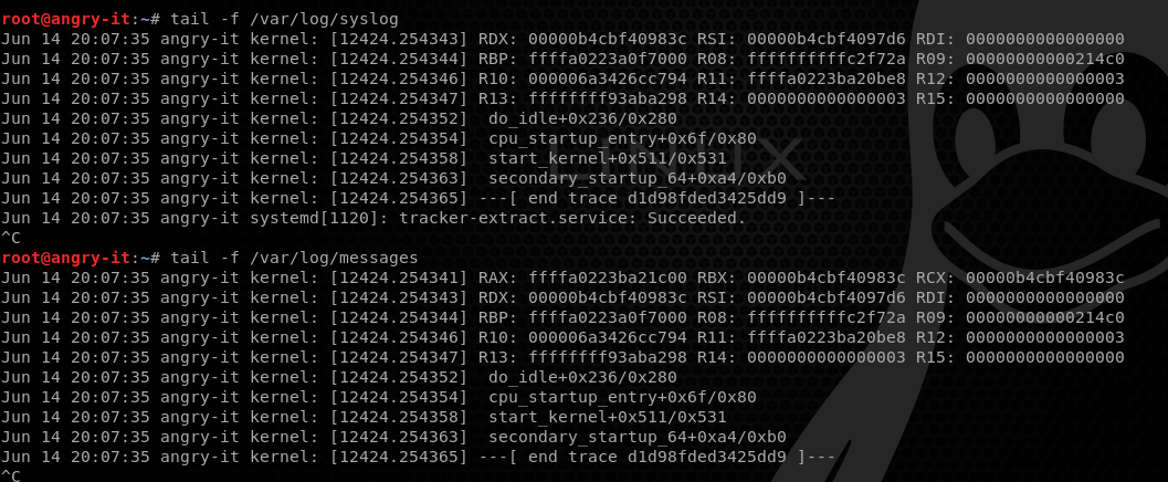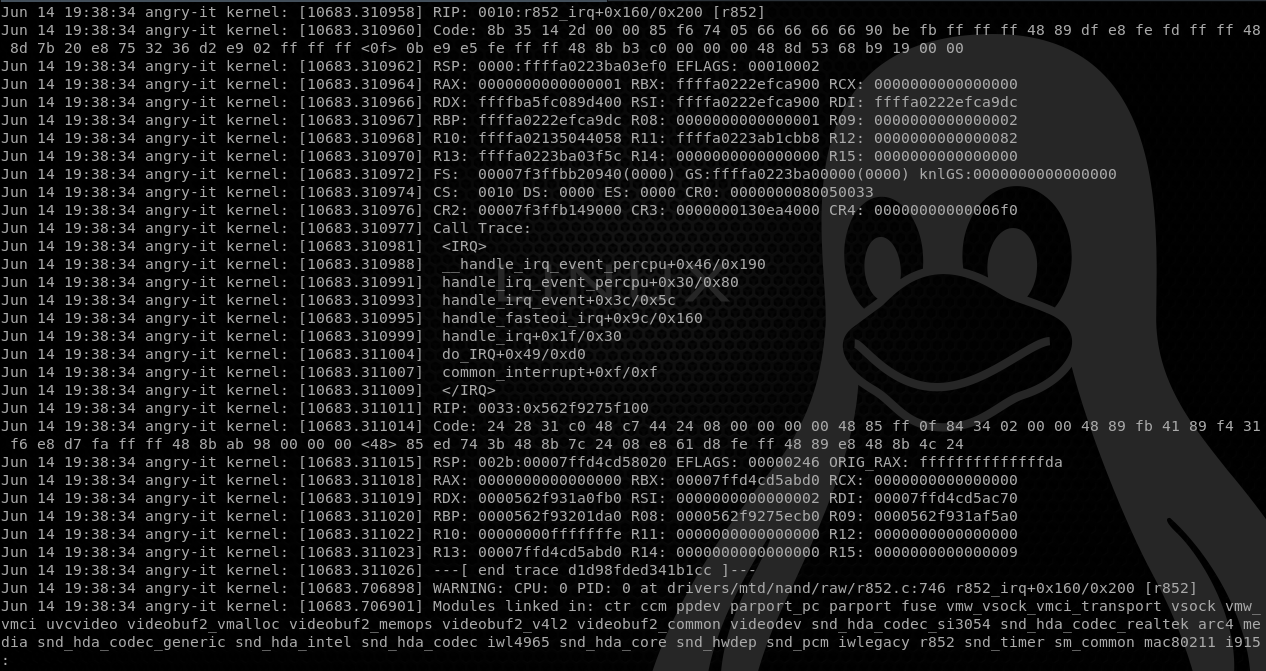 | Additional Information | example: root@angry-it:~# tail -f /var/log/syslog Jun 14 20:18:34 angry-it kernel: [13083.506440] RIP: 0010:r852_irq+0x160/0x200 [r852] Jun 14 20:18:34 angry-it kernel: [13083.614317] WARNING: CPU: 0 PID: 0 at drivers/mtd/nand/raw/r852.c:746 r852_irq+0x160/0x200 [r852] | ||||