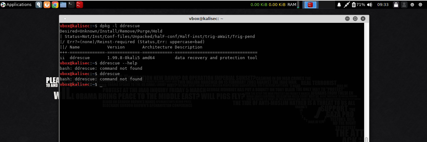 | Description | ddrescue command is not found but the application is installed on the machine, i'm testing on kali live and i'm installed to my machine but the command is not function. | ||||