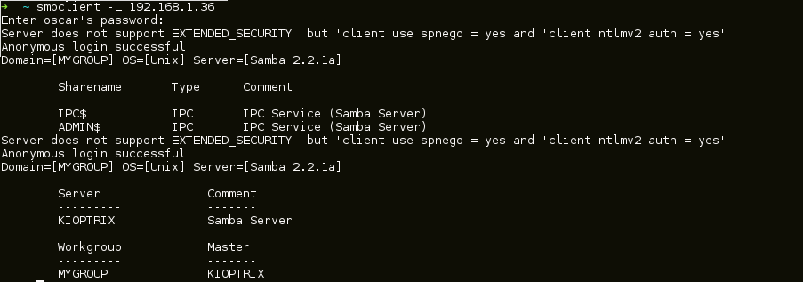 | Description | I discovered this when trying the Kioptrix1.0 VM from Vulnhub. I compared my output with the output from old walkthroughs and my output is not showing the Samba version. I've pasted my output below and attached a screenshot of the older output for comparison. The older output is from this walkthrough: https://blog.roskyfrosky.com/vulnhub/2017/04/01/Kioptrix1.0-vulnhub.html root@kali:/home/john# smbclient -L 192.168.188.135 -v