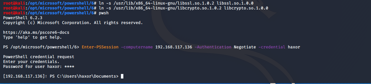 Also noticed that I made a mistake on the symlinks. These are correct working symlinks to obtain a PSSession from Kali to Windows: ln -s /usr/lib/x86_64-linux-gnu/libssl.so.1.0.2 libssl.so.1.0.0 |