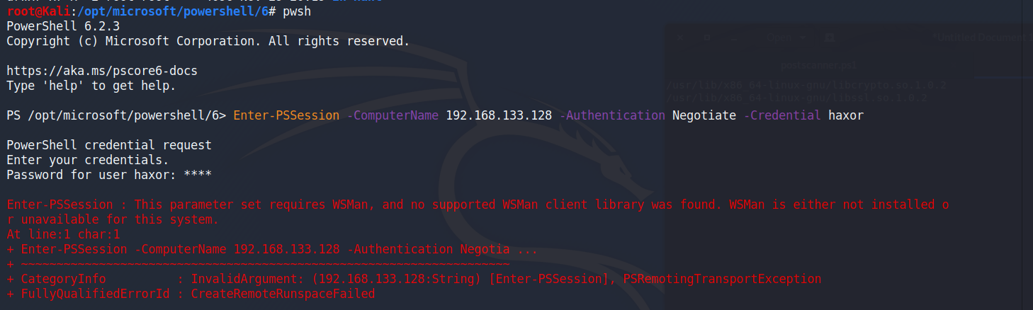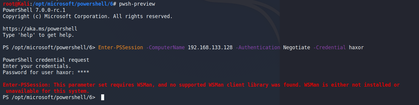 | Steps To Reproduce | In order to resolve this issue I noticed that Kali was missing three subpackages that were required to obtain a PSSession. krb5-multidev Once the packages were installed I navigated to the powershell directory and added the following symlinks in the powershell 6 directory: cd /opt/microsoft/powershell/6 ln -s /usr/lib/x86_64-linux-gnu/libssl.so.1.0.2 ln -s /usr/lib/x86_64-linux-gnu/libcrypto.so.1.0.2 Once the symlinks were added I re-ran the test to obtain a PSession to my Windows target and was successfully able to get a session. pwsh Enter-PSSession -computername (IP ADDRESS) -Authentication Negotiate -credential haxor | ||||