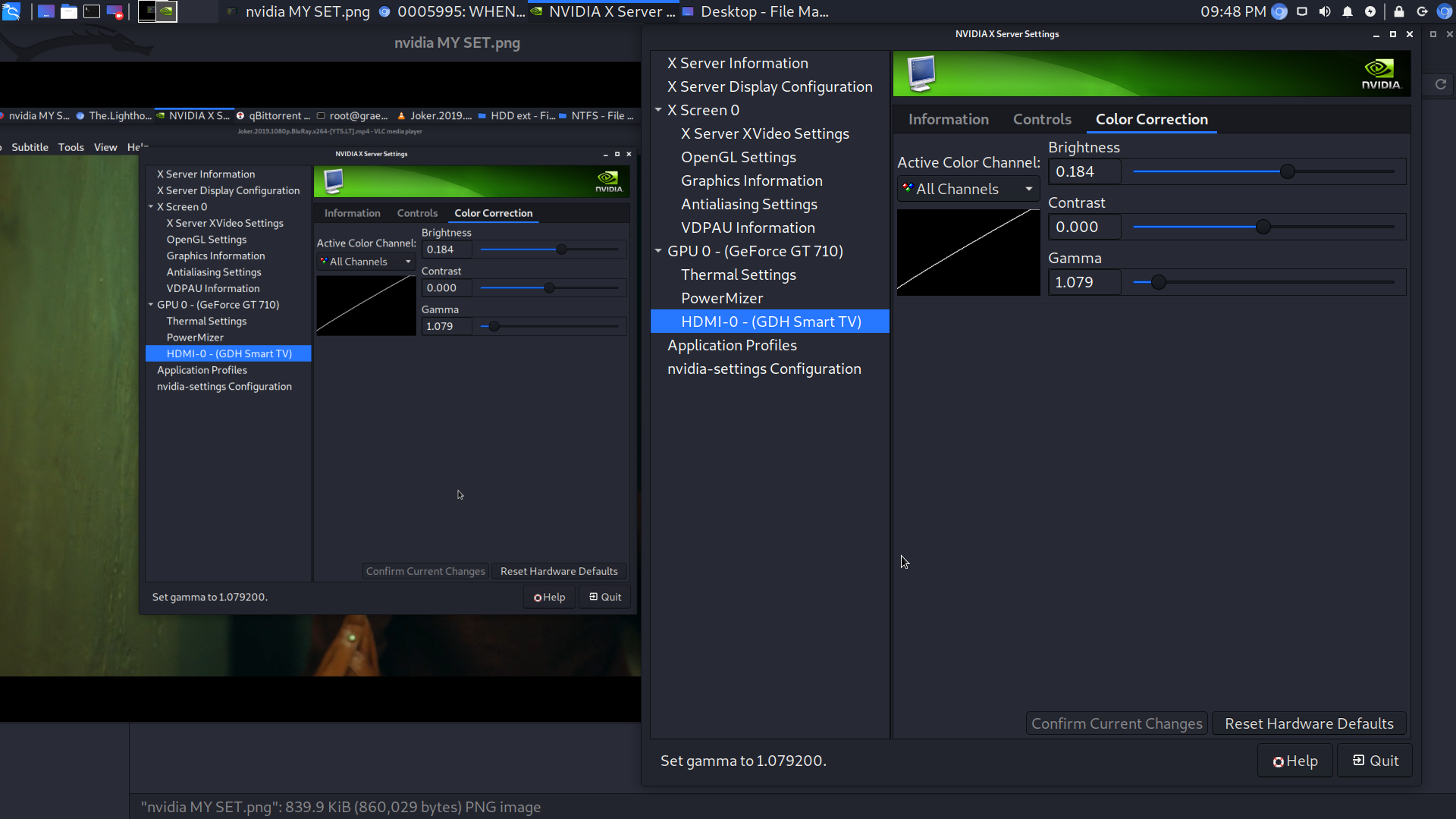 | Description | Graphics is extremely horrid without tweeking the Color setting of the NVIDIA server! For the Geforce 710! I have tried UBUNTU! Same issue! It's across the board of the LINUX systems! Aint up to scratch with the latest SUPER DOOPER CARDS! BUT I find the playback of videos is EXTRAORDINARY in KALI as compared to fuck face Windows, or UBUNTU!!!!!!!!! The SCREENGRAB shows my saved settings AS A SCREEN GRAB! I have to reset the color settings or NVIDIA server to those, the BIG window is the server! | ||||