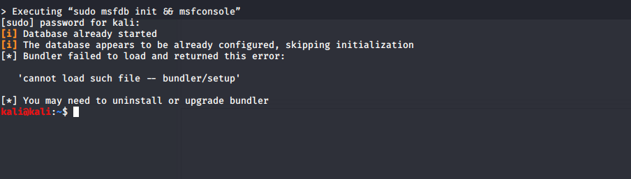 the issue is fixed in metasploit-framework version 5.0.74-0kali2 You need to update metasploit: Check which version you have: And you should uninstall bundler you have installed with gem, with a command like "gem uninstall bundler" |