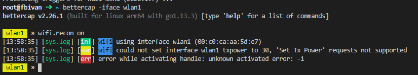 | Additional Information | Verified that it was fixed with bettercap v2.26.1 (built for linux arm64 with go1.13.8) on raspberry pi 4 | ||||