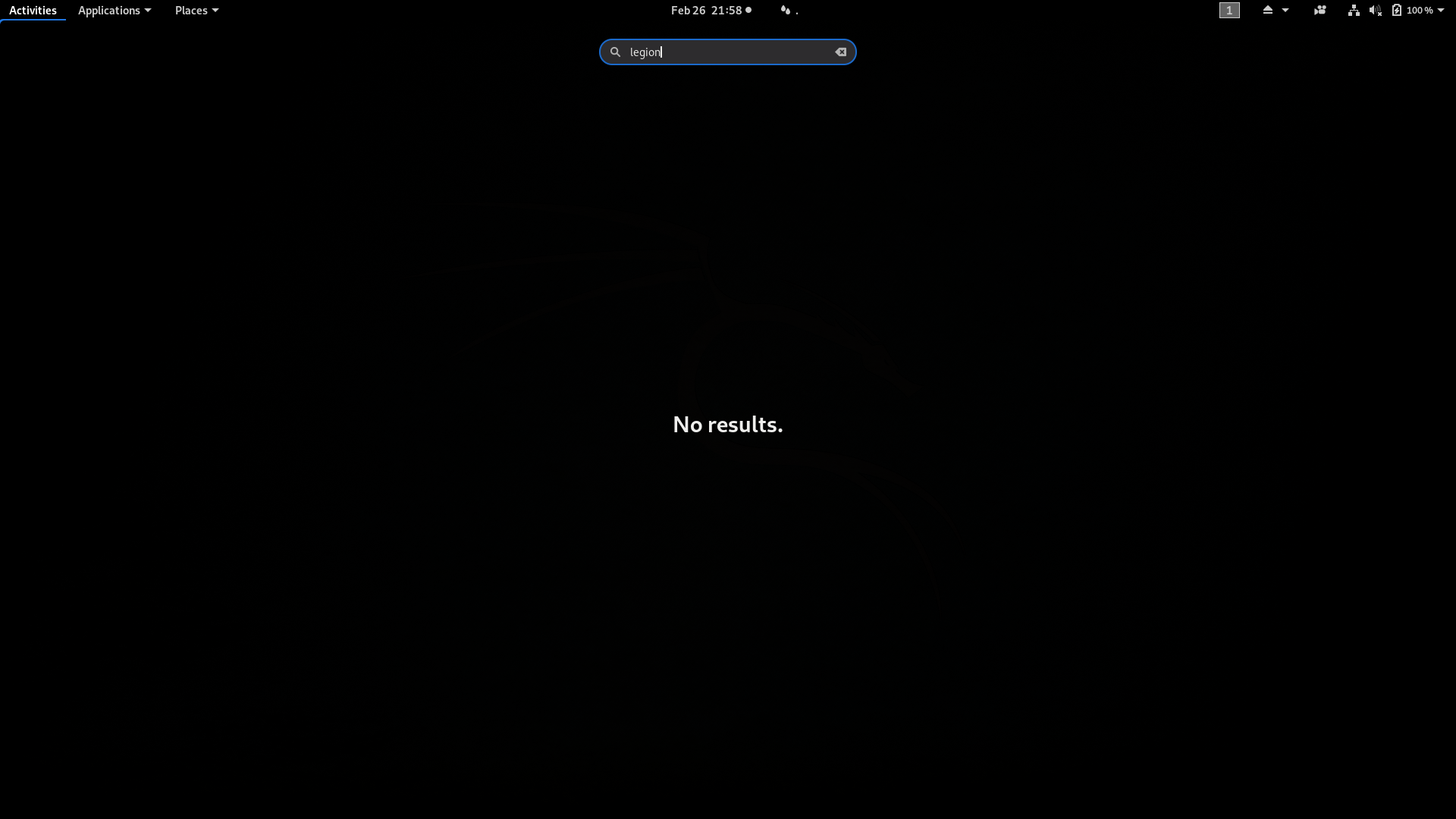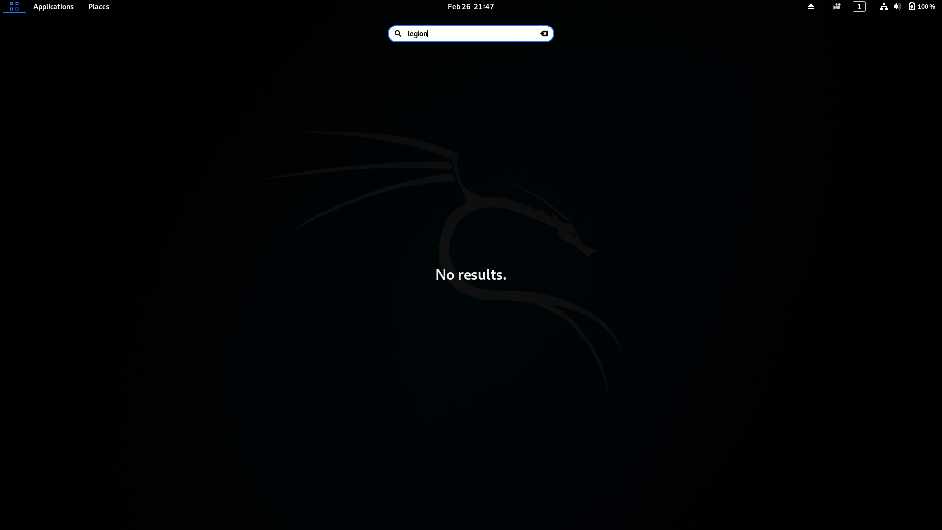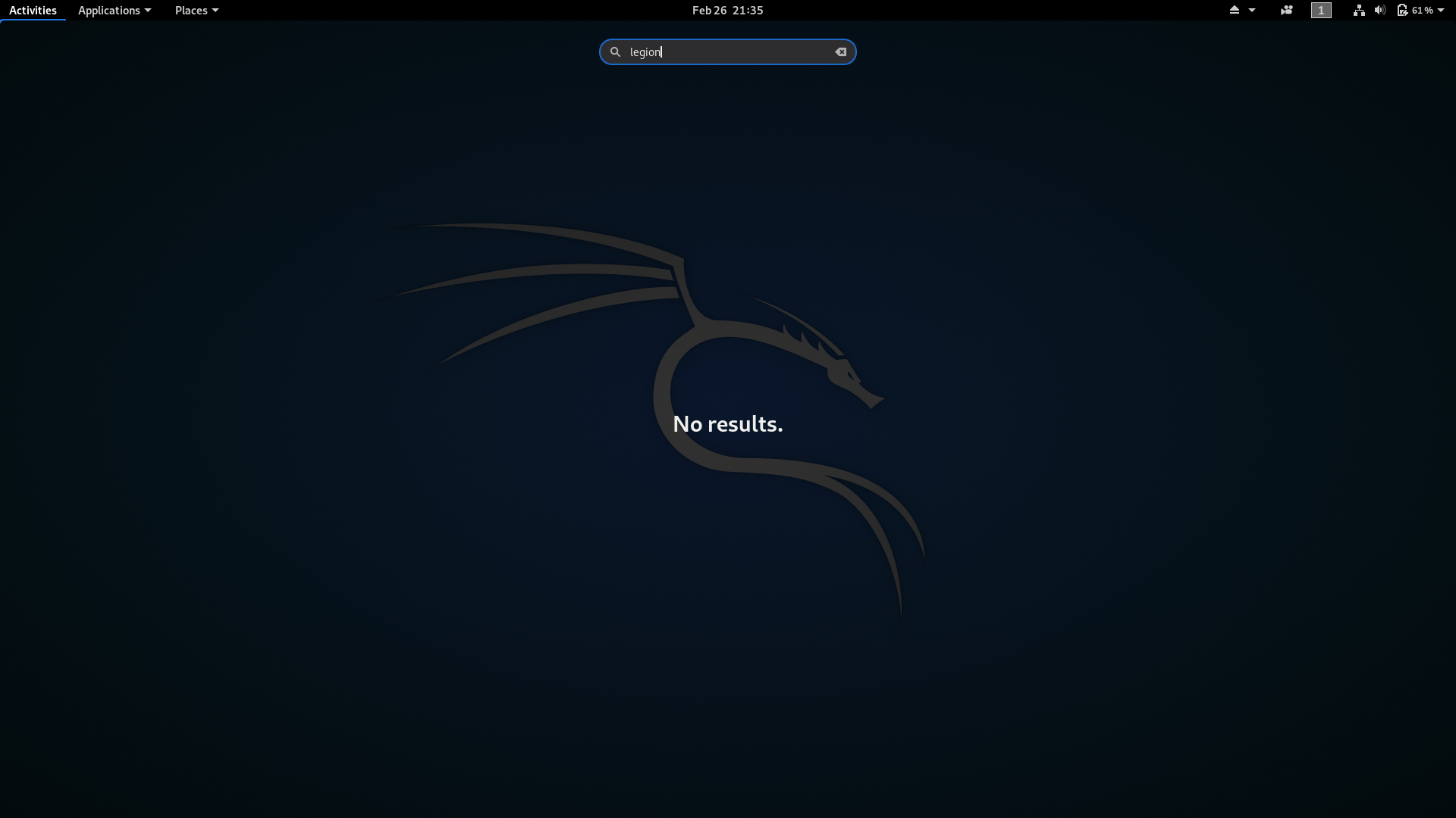 kali-linux-default depends on legion, which does replace Sparta , which does show up here in the menu as sparta- If you click the menu icon and start typing in legion, does the Sparta icon show up? If you're still having issues though, this is better suited for the forums and not the bug tracker. |