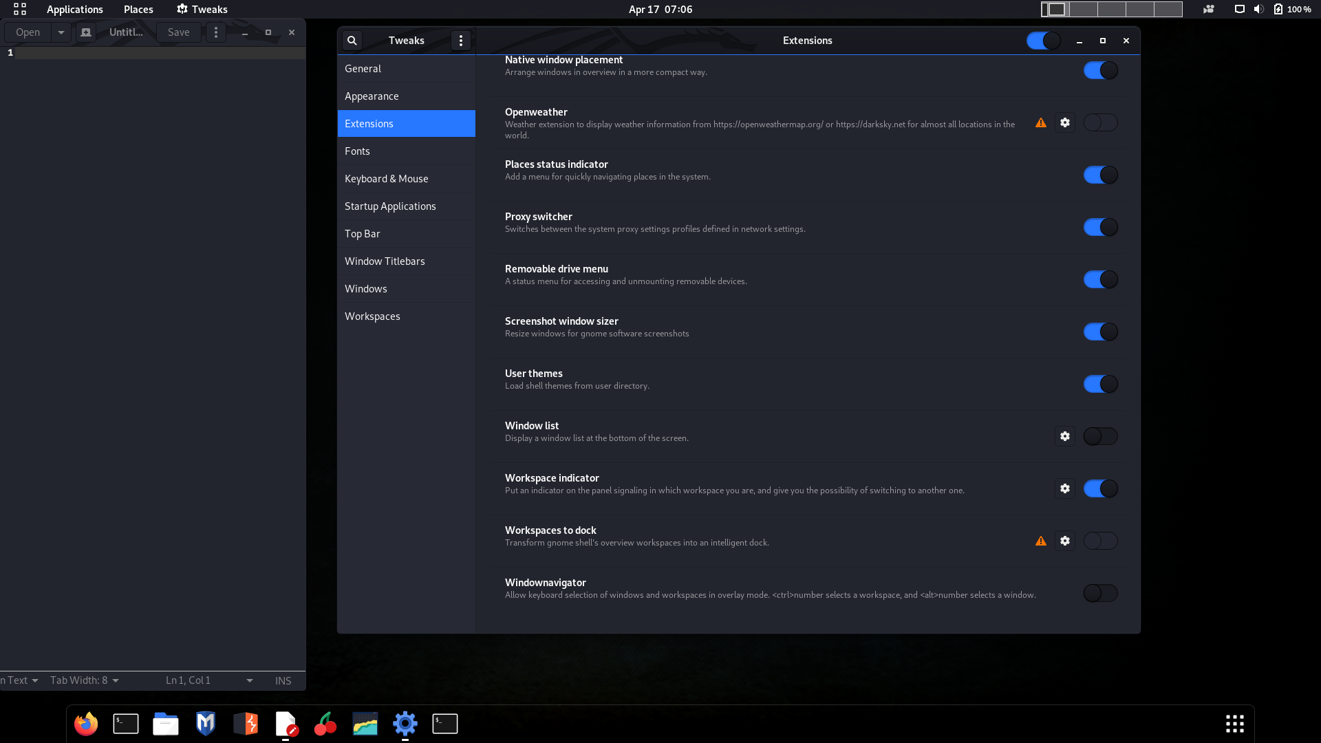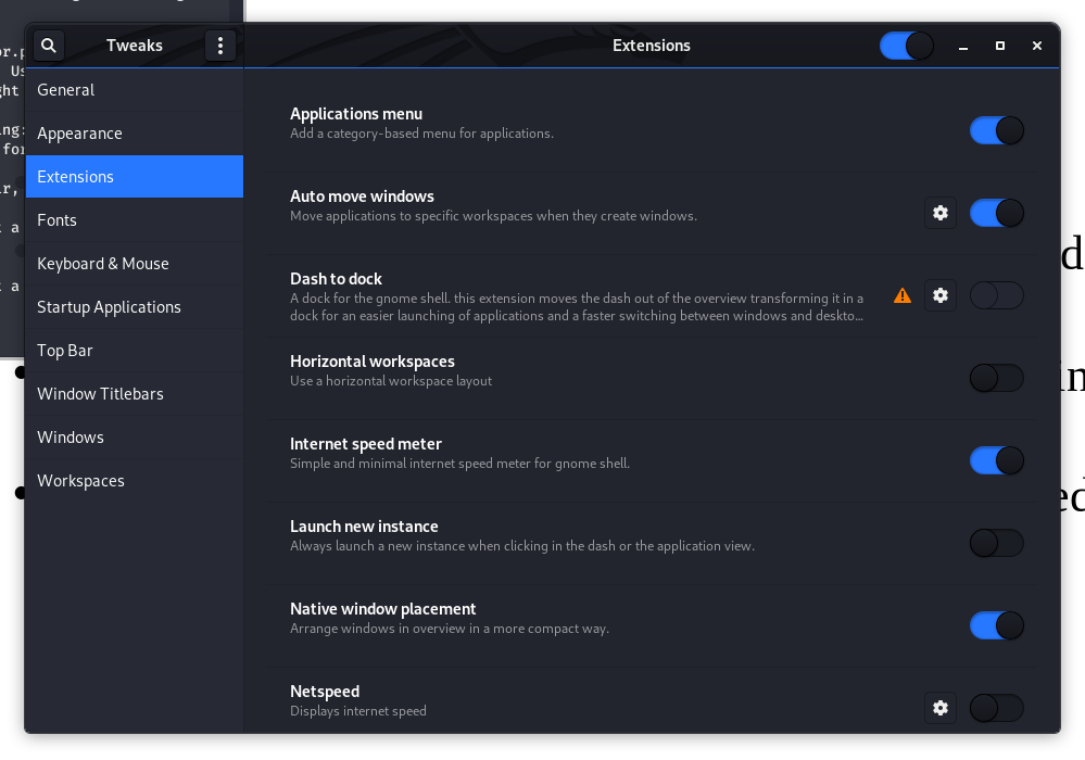• Just a 'heads-up'... I attached a screenshot of/in tweaks/extensions. 'Workspaces to dock' may be outdated. Mine do not appear.