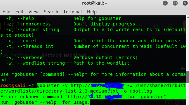 | Description | Team Even after updating gobuster in Kali VM, I am getting below error, please support " Error: unknown command " while trying to use -u coomand moreover it is not showing in its lib -u and other major commands while trying to get help in terminal thanks in advance | ||||
