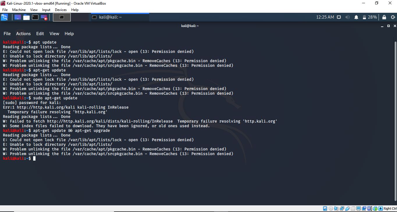 This is a bug tracker, not a support forum. You would need to request assistance on our forums - https://forums.kali.org You need to run all apt commands with sudo because they require elevated privileges, and you need to fix your network because DNS resolution isn't working. |