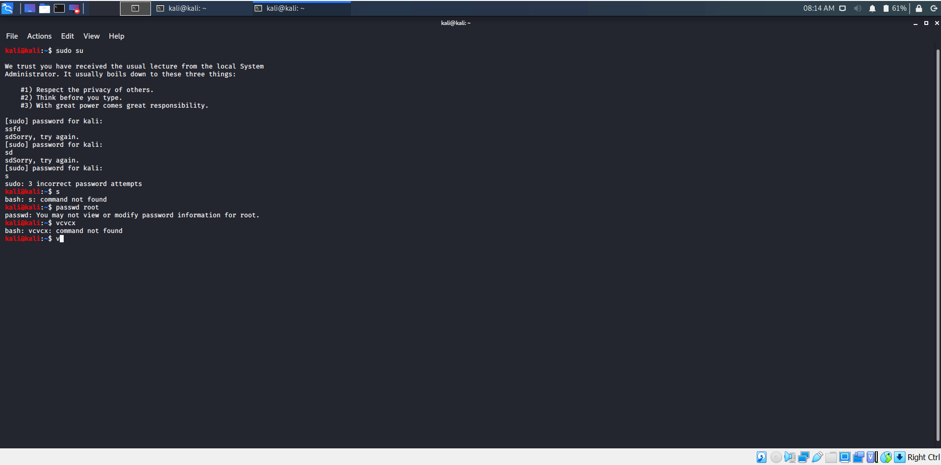 Support requests need to go to the Kali Forums located at https://forums.kali.org Just so you know, when you enter passwords, they are not echoed back on the terminal, but the input is happening. |