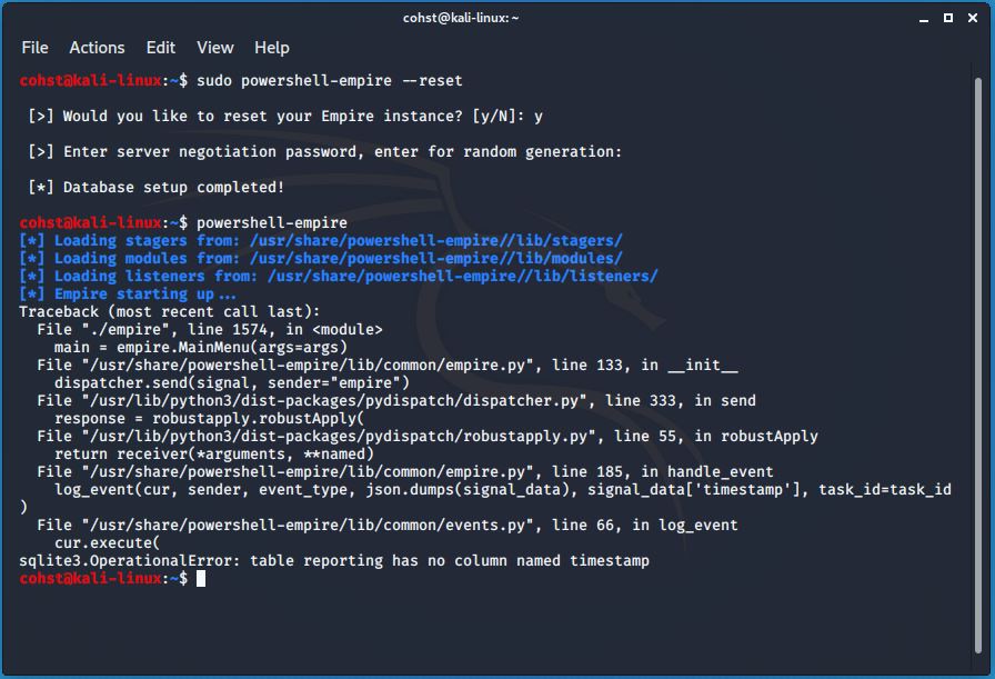 Don't run the reset db with sudo if you usually run powershell-empire without sudo: If you run the reset with sudo, it will reset / setup the database in /root/.local/powershell-empire. And after, if you run powershell-empire without sudo, it will use the database in /home/current-user/.local/powershell-empire |