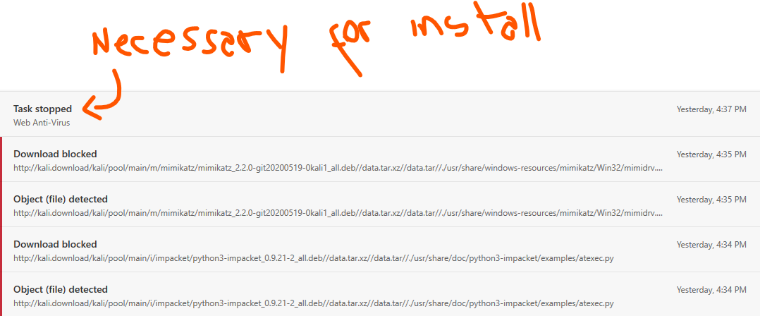| Description | I have Kaspersky Endpont Security and was doing a fresh installation on VirtualBox of Kali 2020.2. The process of installation failed because Kaspersky block certain download url (http://kali.download/). So I have to stop de Web Anti-Virus Task Scan to make the installation work. More than a bug I find it weird that the download page in the installation process was the site http://kali.download/ without secure access (HTTPS) Just for your consideration | ||||