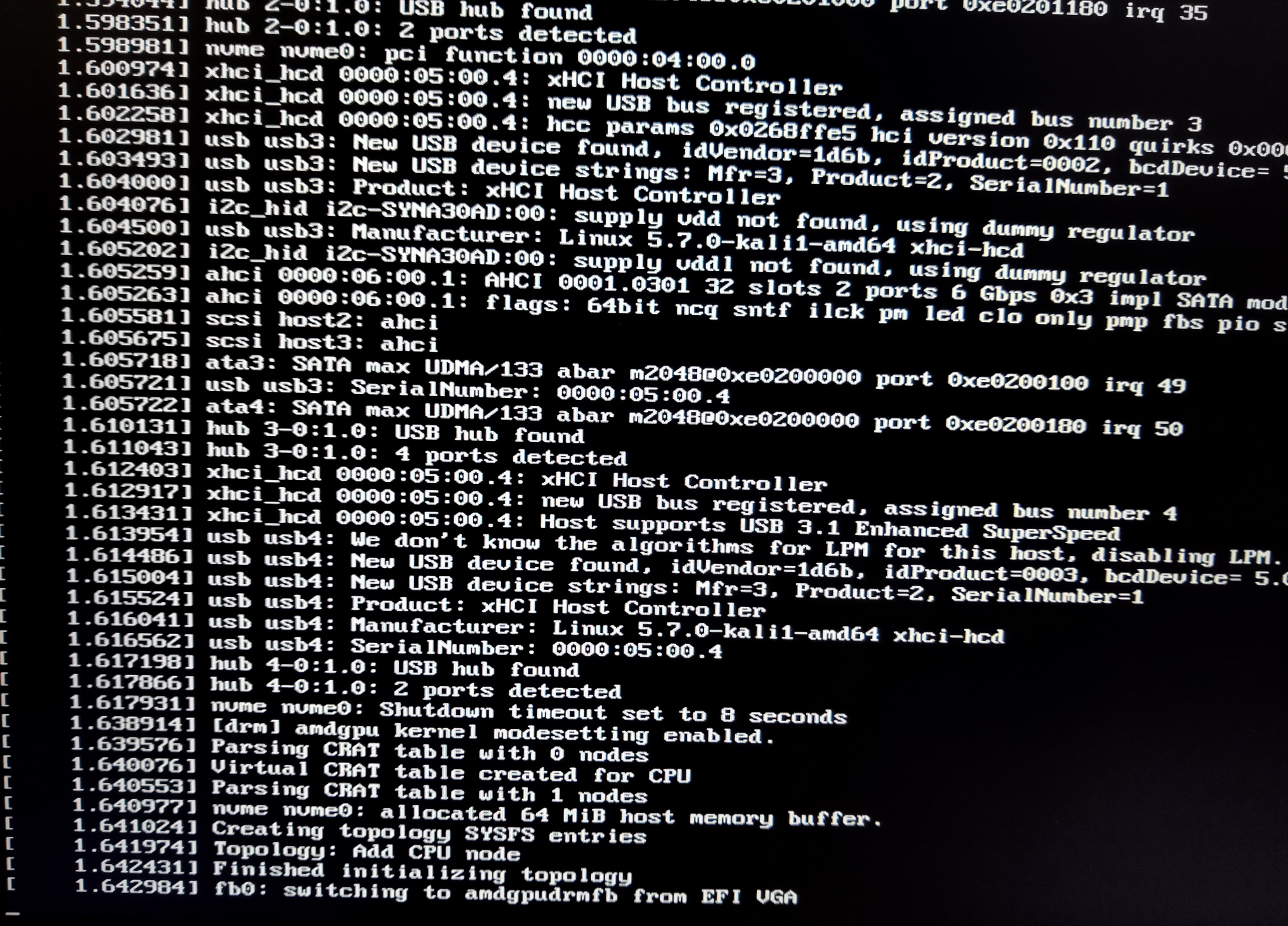 | Description | After installing the Kali operating system with 4700u laptop, AMD's first product, it failed to start normally. It was started in normal mode and single user check mode respectively, and then the screen error message screenshot was taken. See the attached picture for details. Is it because Linux kernel 5.7 does not support AMD's latest 4000 series chip products? The other is that during installation, if you choose to install GNOME desktop, it will get stuck in the interface of gdm3 configuration, and there will be no further progress and no response. Please repair the system as soon as possible, otherwise。 | ||||