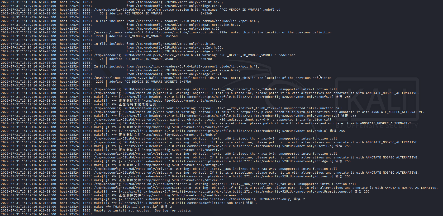 Most likely not a problem in Kali. VMware Player and Workstation are known to always having issues with newer Kernel versions like shipped in Kali and support for newer Kernels are always lacking behind weeks or even months: https://github.com/mkubecek/vmware-host-modules/tree/workstation-15.5.6 |