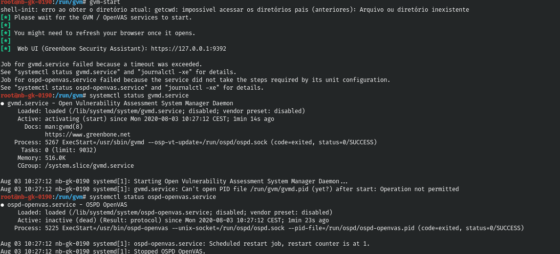 Hi Manteiners. As reported by "vanguard", I tested on four test devices and the migration from 9 to 11 not working properly. For all, I folowed all steps (MIGRATION-FROM-9-TO-11.txt) and see below erros that I found: Error is: GMP Service is down (image0.jpg) 1 - ospd and gmvd not working properly: /run/ospd/ and /run/gvm/ was not created during the migration process (image 2.jpg). Do you know a possible solution for it? or if you have a plan to adjust? Have an excellent new week. Alisson Lara |