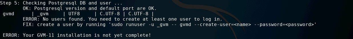 Yes, no problem. This is original, before my change: pg_lsclusters 5438 Now edited postgresql.conf to 5432, and restarted postgresql: Ok, now it is the correct port. Testing now gvm-setup to get clear, every steps are configurated, looking good so far. Now starting, gvm-start, looking good! Last, adding a new user named testuser, and starting webbrowser pointing to https://127.0.0.1:9392 Try to login, however, the given password in plain text does not work, but the password shown in the shell when creating the new user is working, Hurrah! Looks like everything is ok now. Wow, that was a long way! So it was the "wrong" port in postgresql. For me it is looking like either the port in the postgresql package is not correct or the required port in the gvm package. One should be corrected. I never changed any of the default configurations, and postgresql 12 was freshly installed as well as gvmd. Additionally I found no note, to check for postgresql, but I suggest, we should add this to "MIGRATION-FROM-9-TO-11" so other people might not run into the same trap. For me it looks like the problem is fixed, but needed lots of manually work. Maybe it is possible, to improve the installer, to change the ownerships of the rerquired directories, creating a user, check for the correct postgresql port and all the stuff, we had to do manually. For me personally I wondered, why there were the old postgresql version installed, because I am deinstalling regularly all old stuff from kali. I do this with apt autoremove, orphaner and apt-get --purge remove 'deborphan --guess-all' . This worked on my debian systems well, somehow did it not on kali. Please let me watch this in the future. @alara Try the same as I did, for me it this bugreport can be closed, but if it is still not working for you, just let it open and close it at your will. Thank you all very, very for your help and please apologize if I was sometimes a little bit beside me. Best Vanguard |