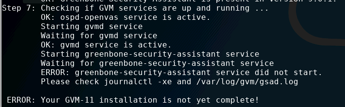 Following the documentation to change from openvas7 to gvm11, I could add a user and start the webinterface. However, gvmd is still not running, so I get error at login. |