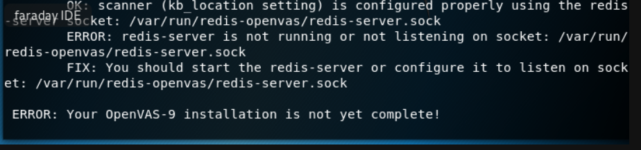 You ran the obsolete openvas-check-setup (the message is "Your OpenVAS-9 installation...") Run the "gvm-check-setup" provided by gvm package. And remove your obsolete openvas package to avoid confusion. I don't know what happened (maybe you reinstalled openvas?) but if I read correctly the message, your [email protected] is no longer correctly setup: If you change it, you will need to restart the [email protected] Once you have fix that, if you still have a message error about "Could not connect to Scanner at /tmp/ospd.sock", And restart the [email protected] again |