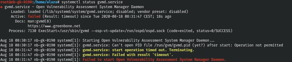 @sbrun I tested again on my fresh installed machine (updated a few minutes ago). greenbone-nvt-sync started as root is telling/usr/bingreenbone-nvt-sync must not be executed as rprivilged user root Unlike the actual scanner the sync routine does not need privileges. This message is logical correct. Maybe the message could be enhanced with the following text: As privileged user "root" run: "runuser -u _gvm -- greenbone-nvt-sync" Think, this will be helpfull for others, |