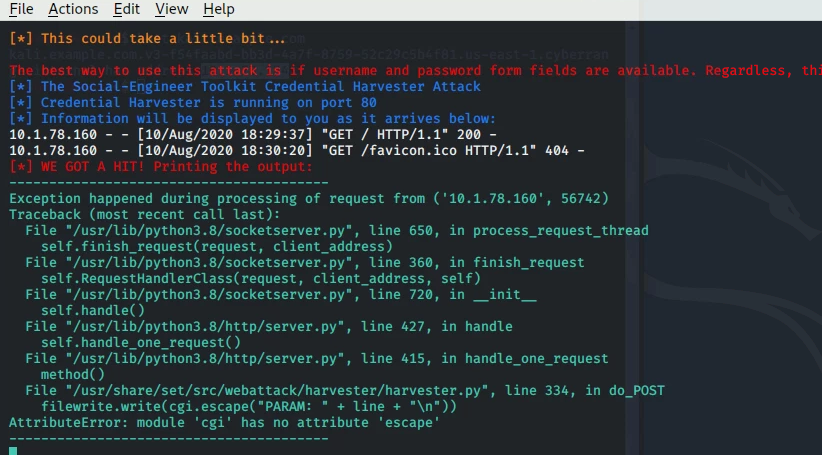| Steps To Reproduce | in v2020.02. (checking in 03 now) Point a browser at the listening IP.. and you get the python 2.7 based errors (from python 3.8). See screen shot. FIX The latest setoolkit obviously needs to be included in the distro. N00b Workaround | ||||